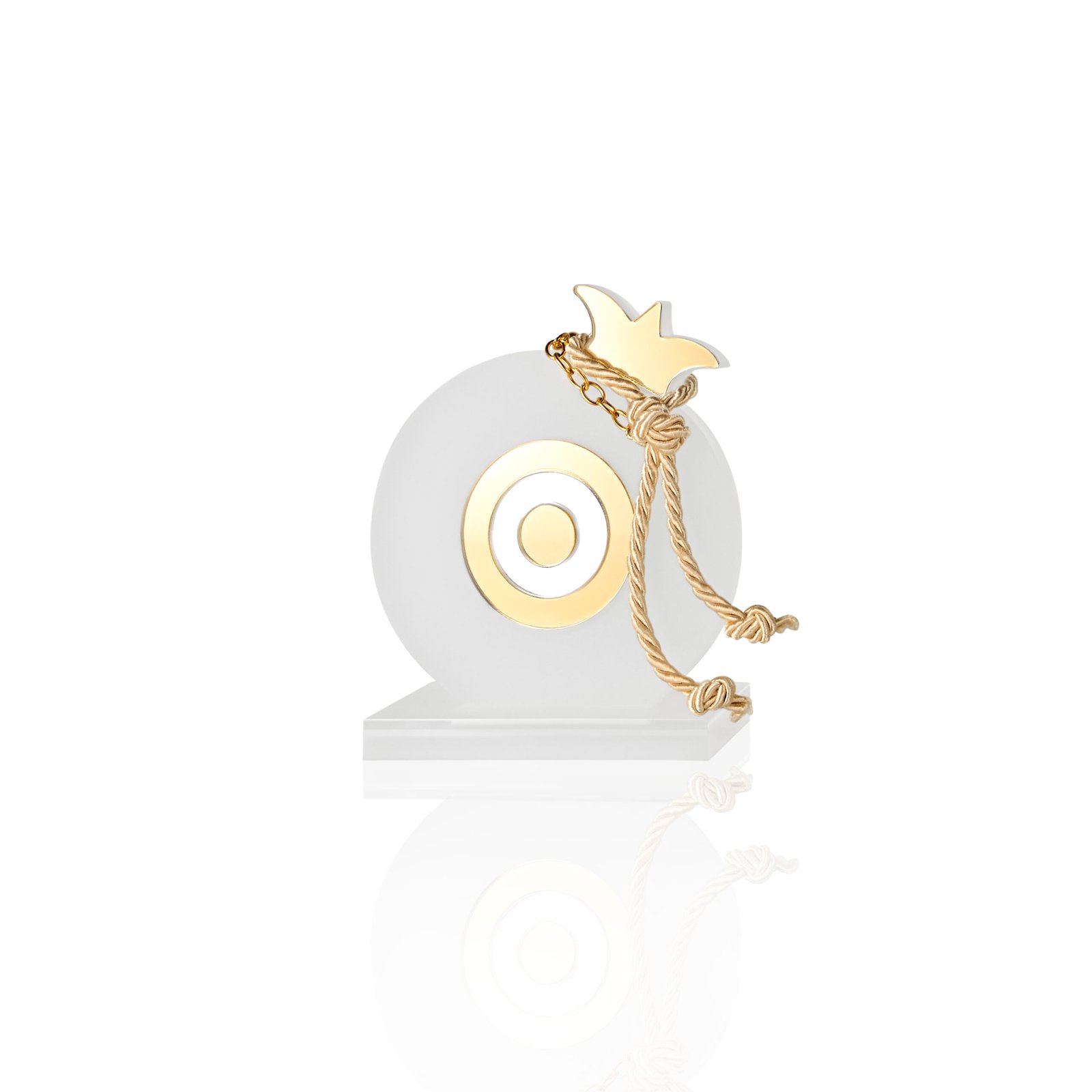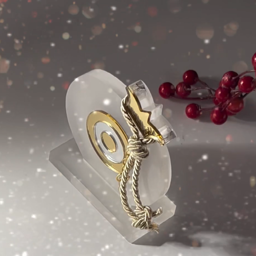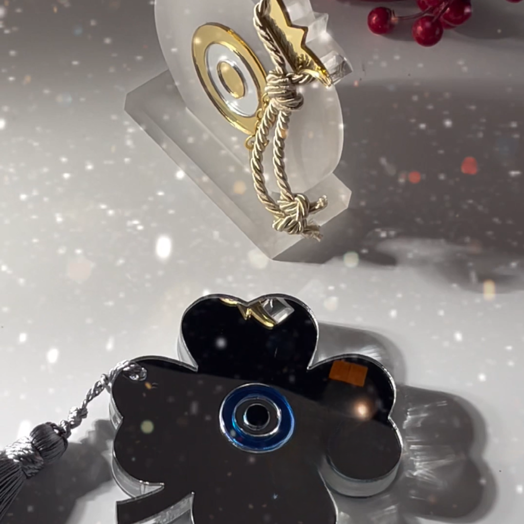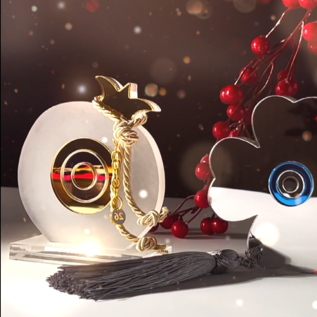 Φέρτε καλή τύχη και κομψότητα σε κάθε χώρο με το χειροποίητο γούρι ρόδι, που συμβολίζει την αφθονία και την ευημερία. Κατασκευασμένο από πλεξιγκλάς και διακοσμημένο με λεπτές λεπτομέρειες από χρυσό και ασημένιο καθρέφτη, διαθέτει ένα διακριτικό μάτι στο κέντρο για πρόσθετη προστασία. Ιδανικό ως μοναδικό δώρο ή διακοσμητικό κομμάτι. Έρχεται σε πολυτελή συσκευασία δώρου.