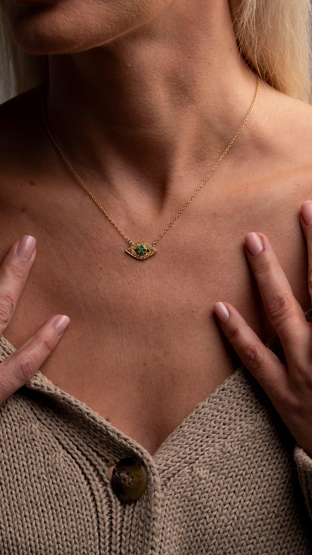 The Cosmic Evil Eye Necklace, showcases a striking design with vibrant yellow stones encircling a captivating green center. This premium evil eye necklace is part of the Moira Collection’s signature jewelry line — a unique blend of symbolism, protection, and modern luxury. A one-of-a-kind necklace that reflects authenticity, fine craftsmanship, and timeless identity — designed exclusively for you.