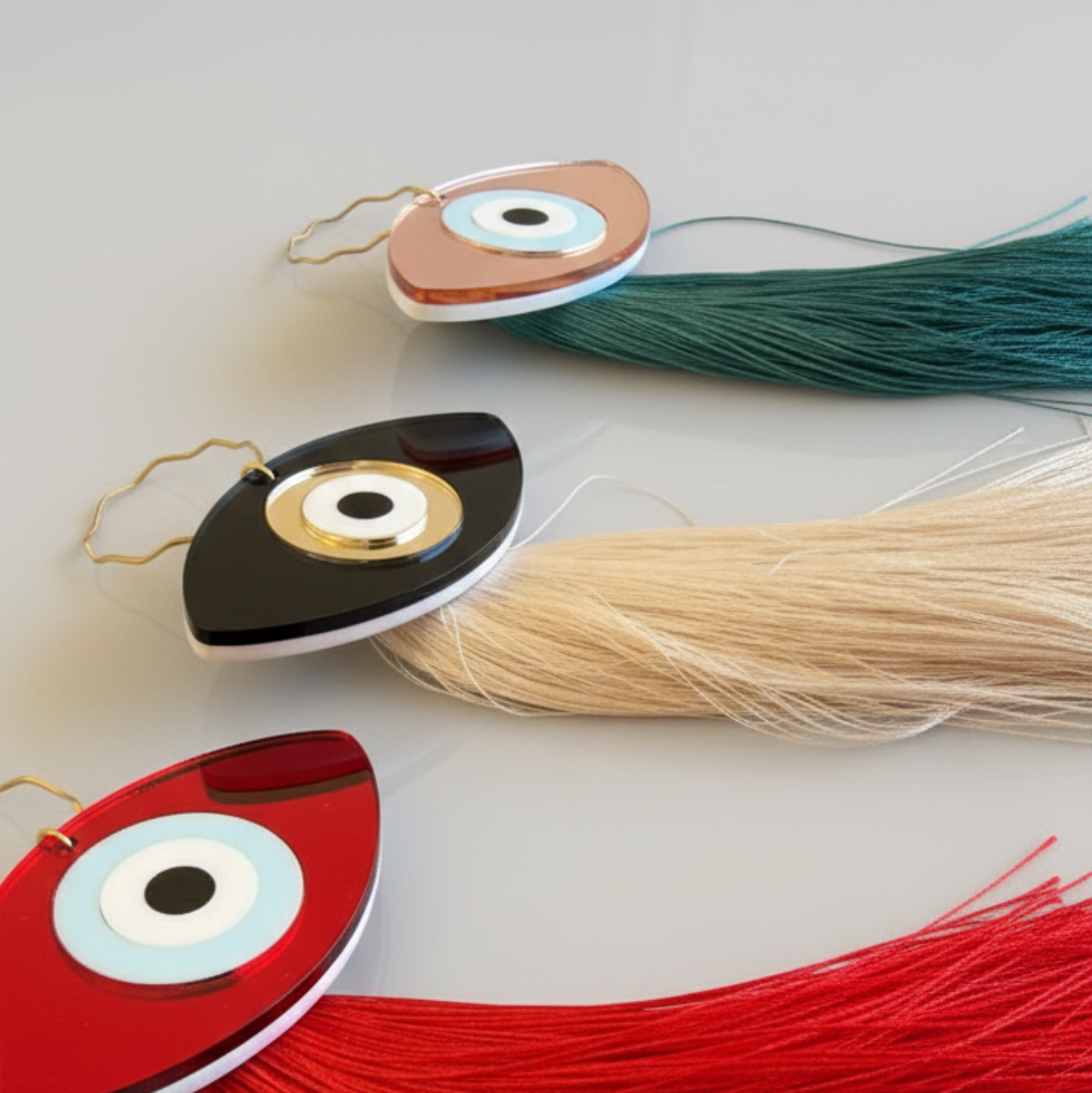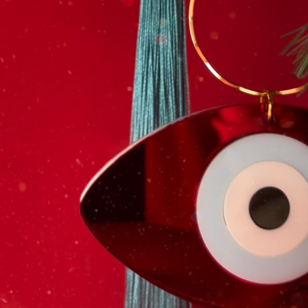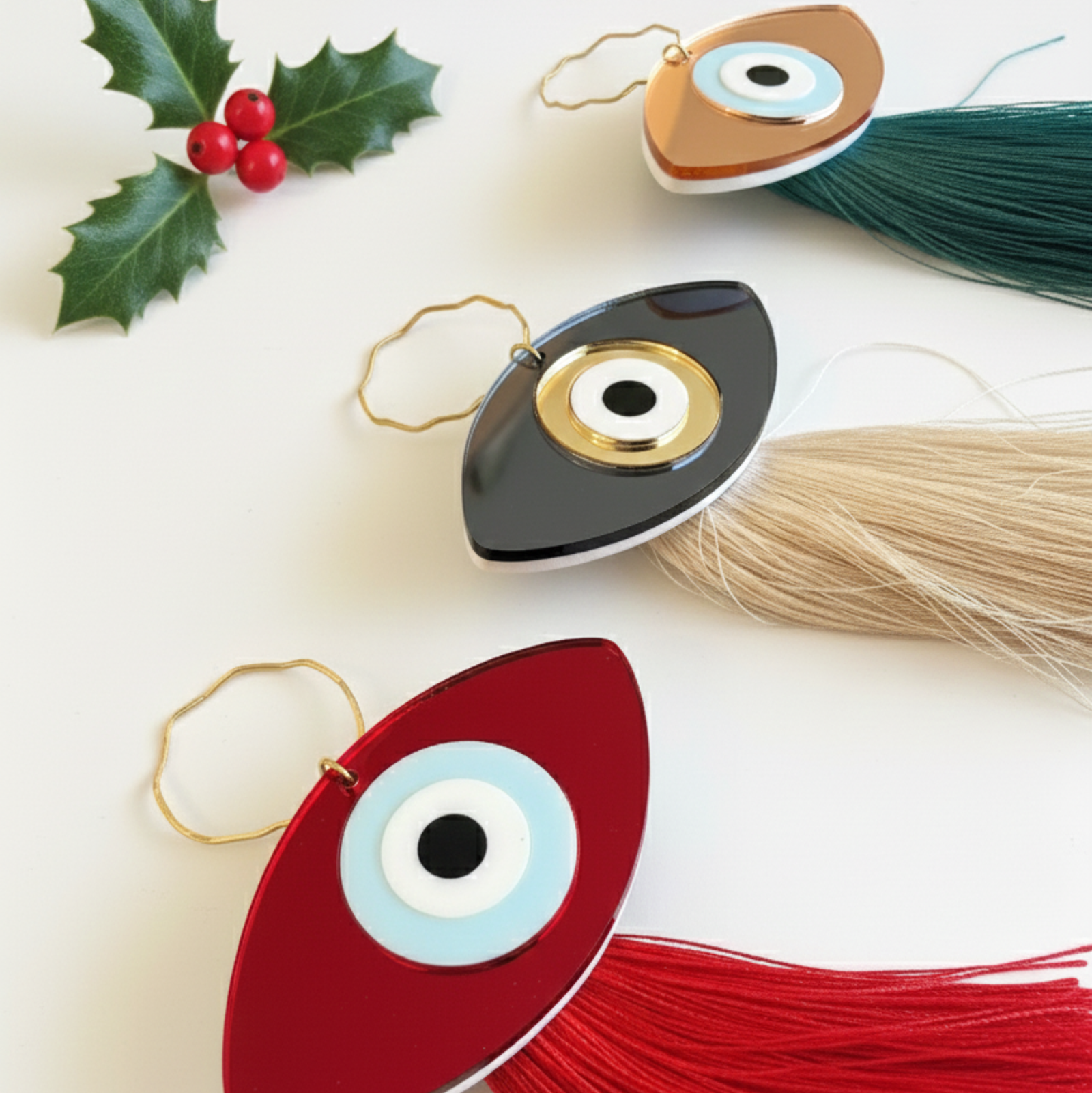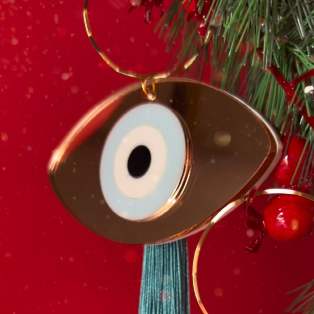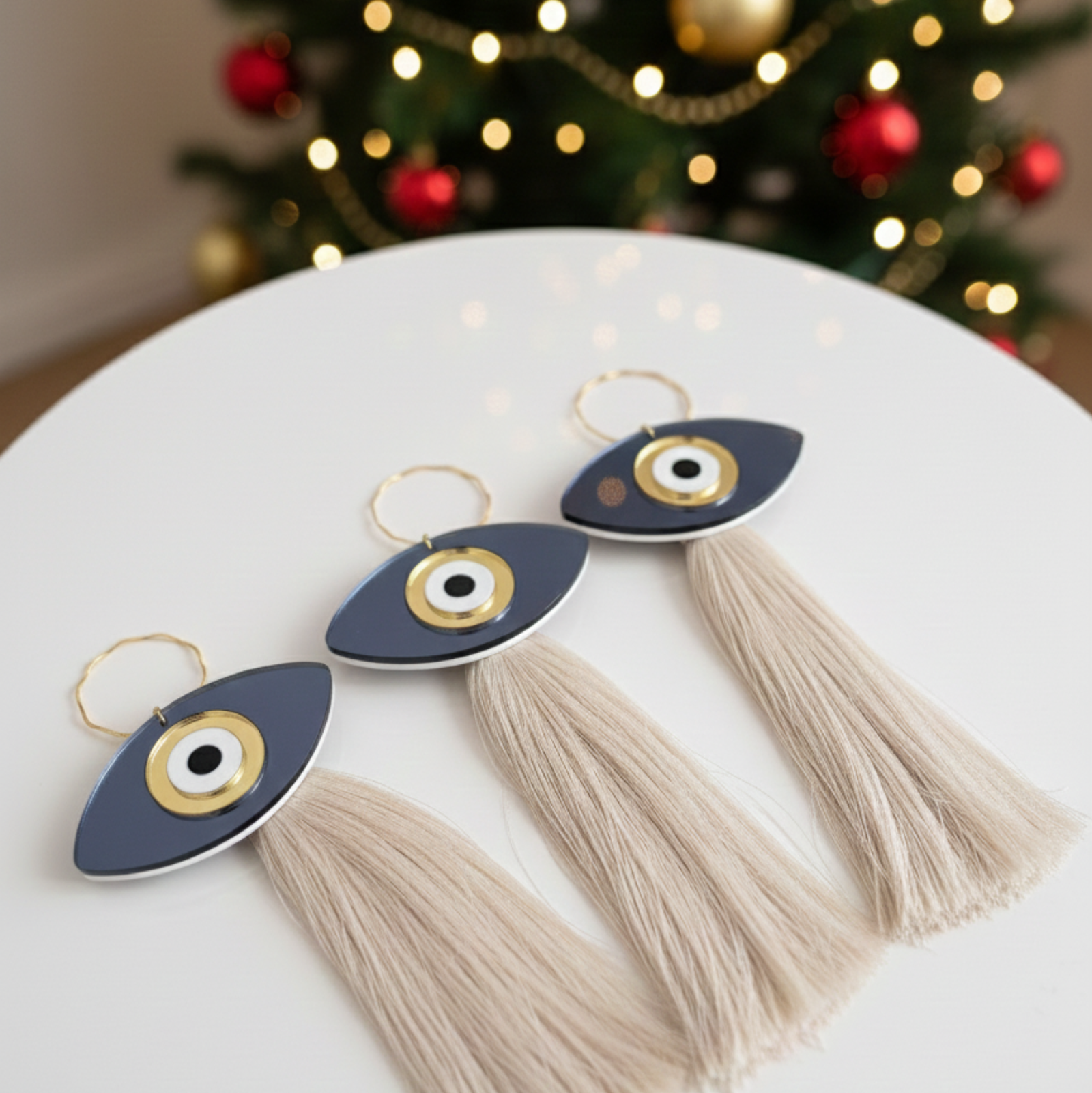A timeless symbol of protection, good fortune, and positive energy, this Evil Eye Festive Charm from the Moira Collection is designed to bring elegance and meaning to the holiday season. Crafted from high-quality plexiglass, the charm features a symbolic evil eye detail, paired with a soft decorative tassel that adds movement, warmth, and a festive touch.