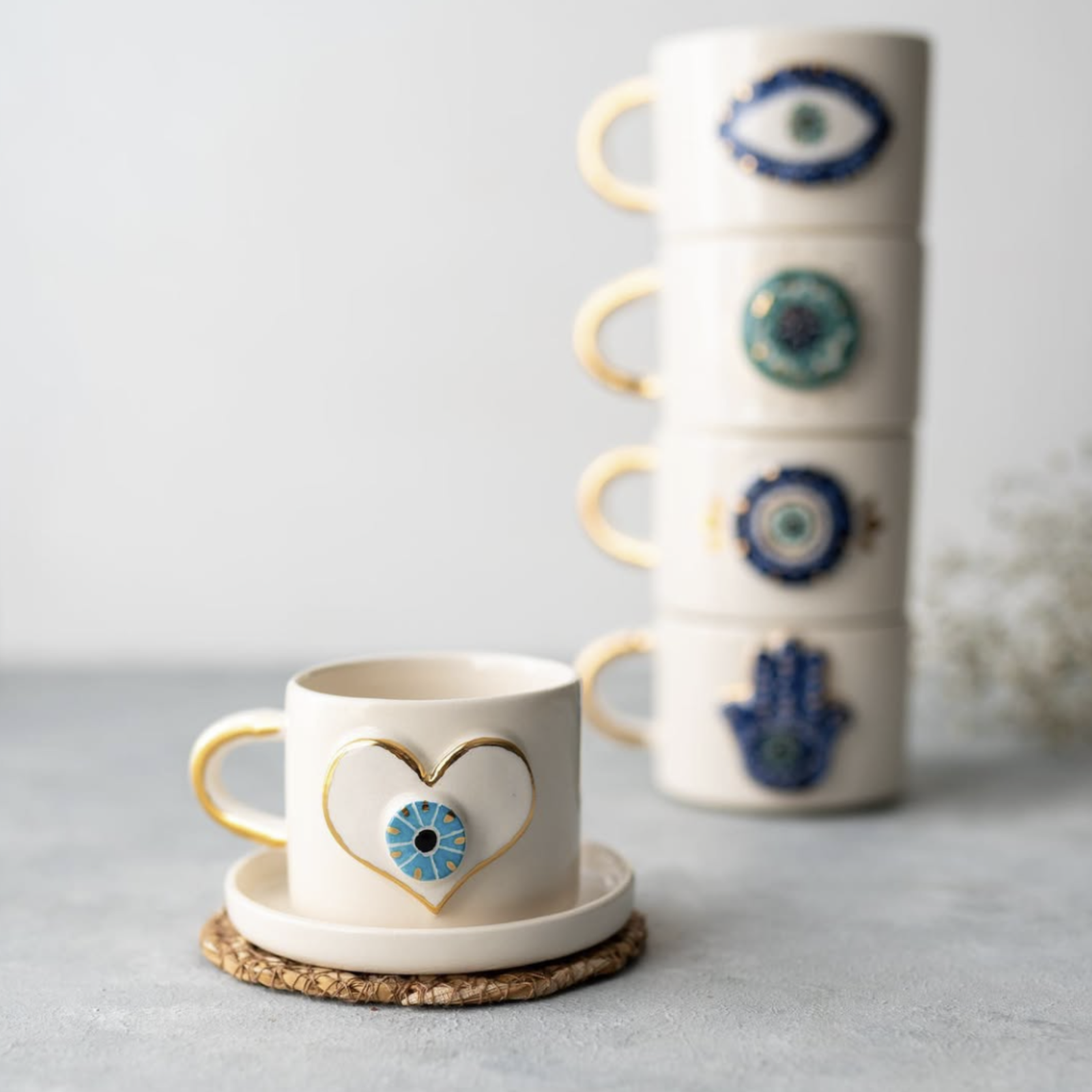 Discover the Moira Collection of handcrafted ceramic mugs and espresso cups, each adorned with the iconic evil eye symbol.