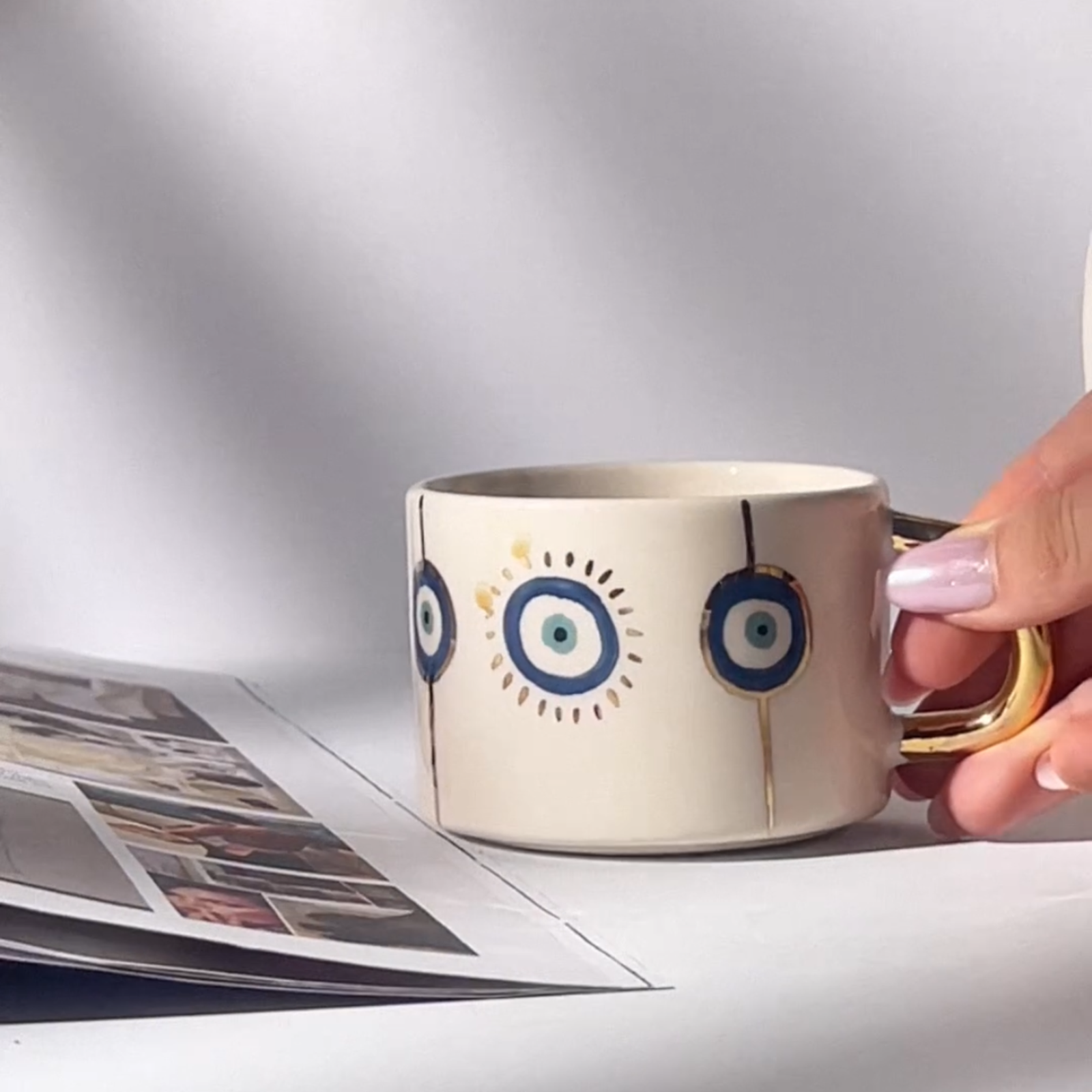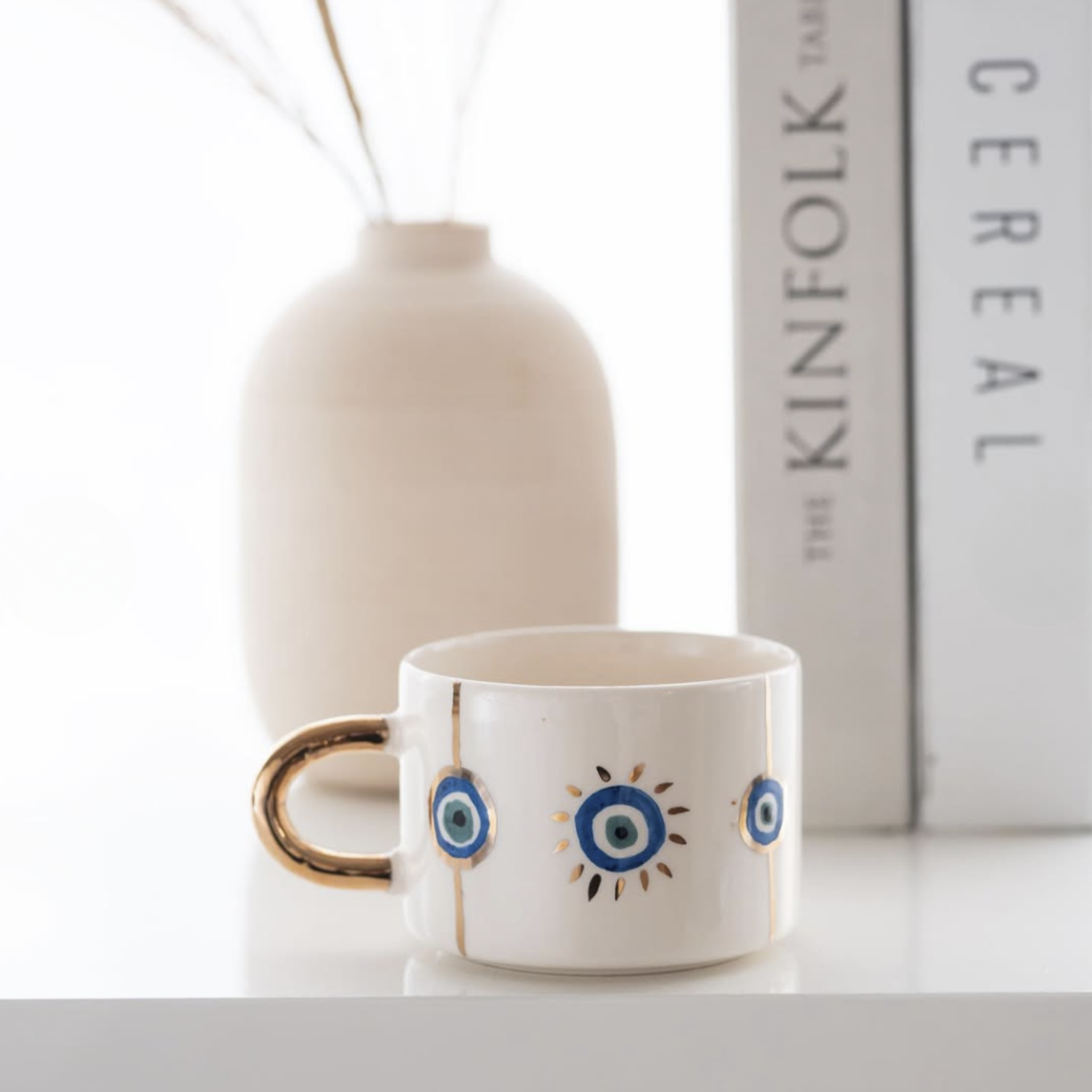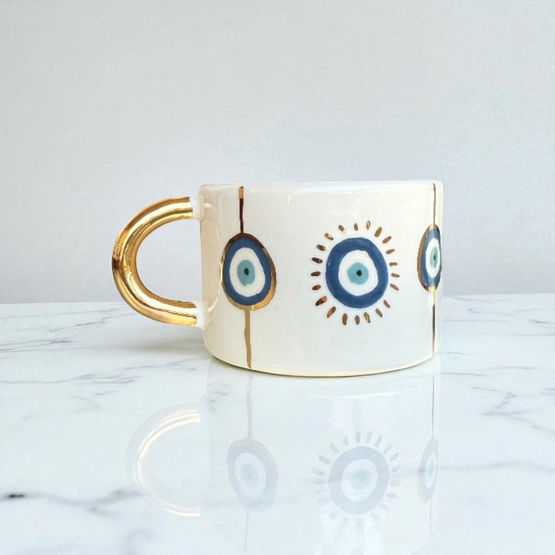 Start your day with a spark of protection and style. Each ceramic mug is handcrafted with love and adorned with a vibrant evil eye motif and 24K gold plated detailing. Unique, joyful, and full of charm—this mug is more than a vessel, it’s a daily ritual.