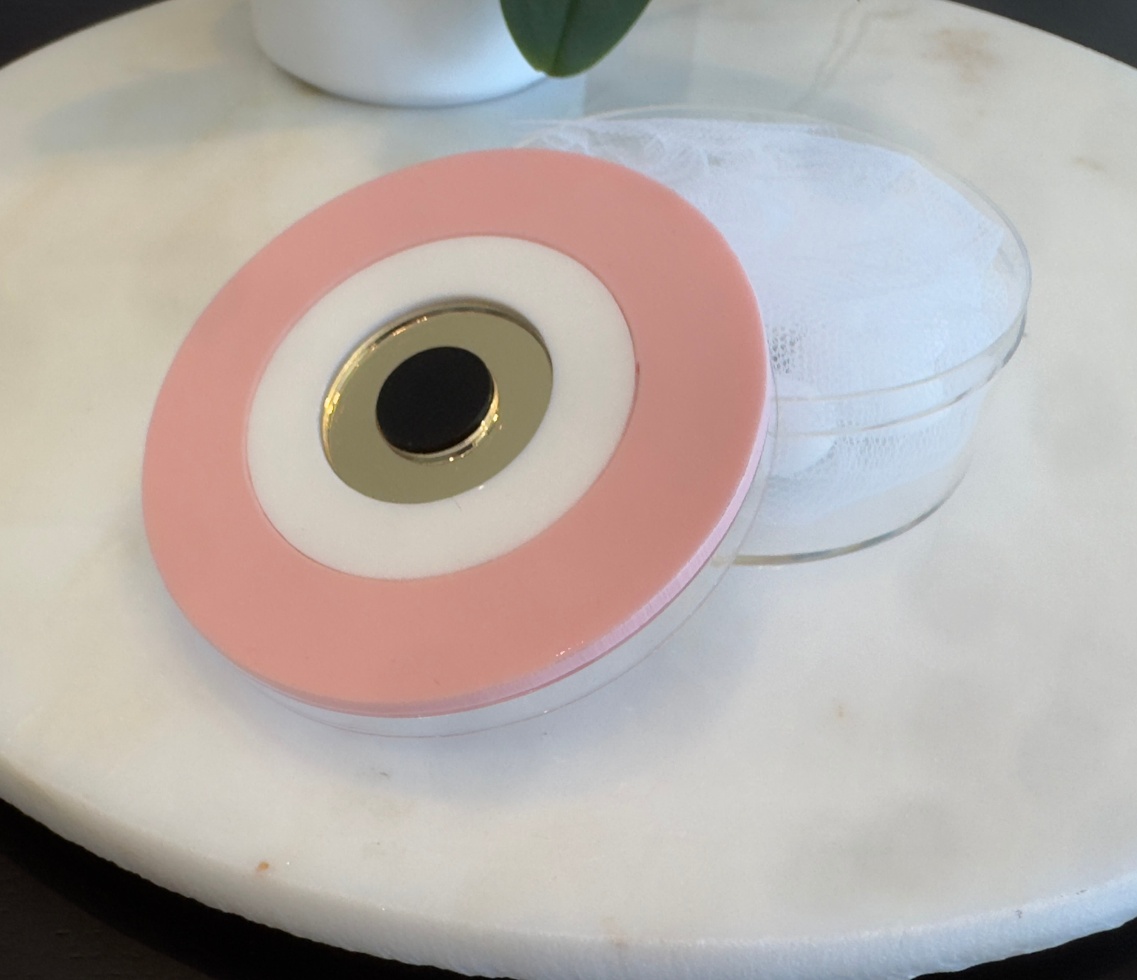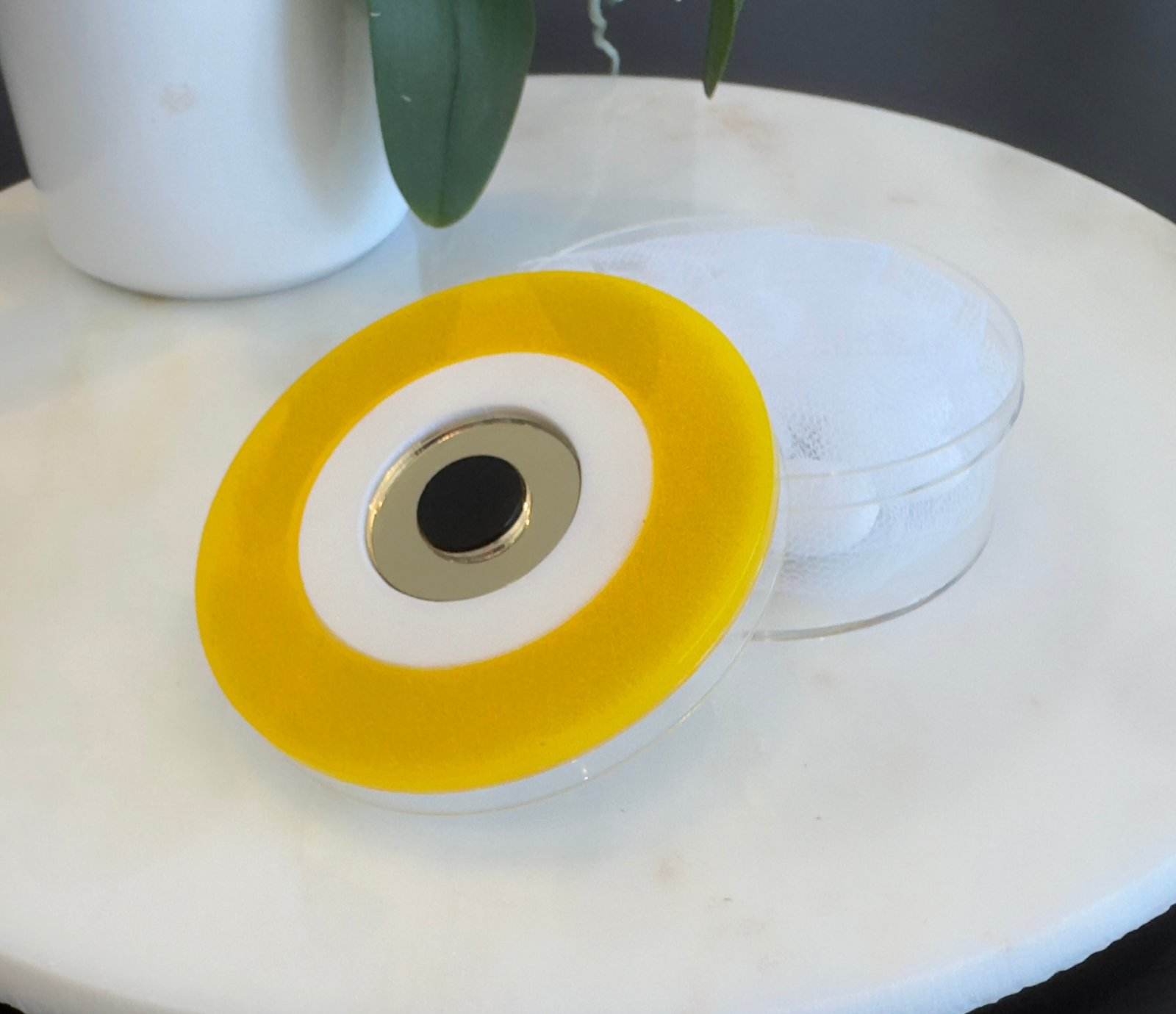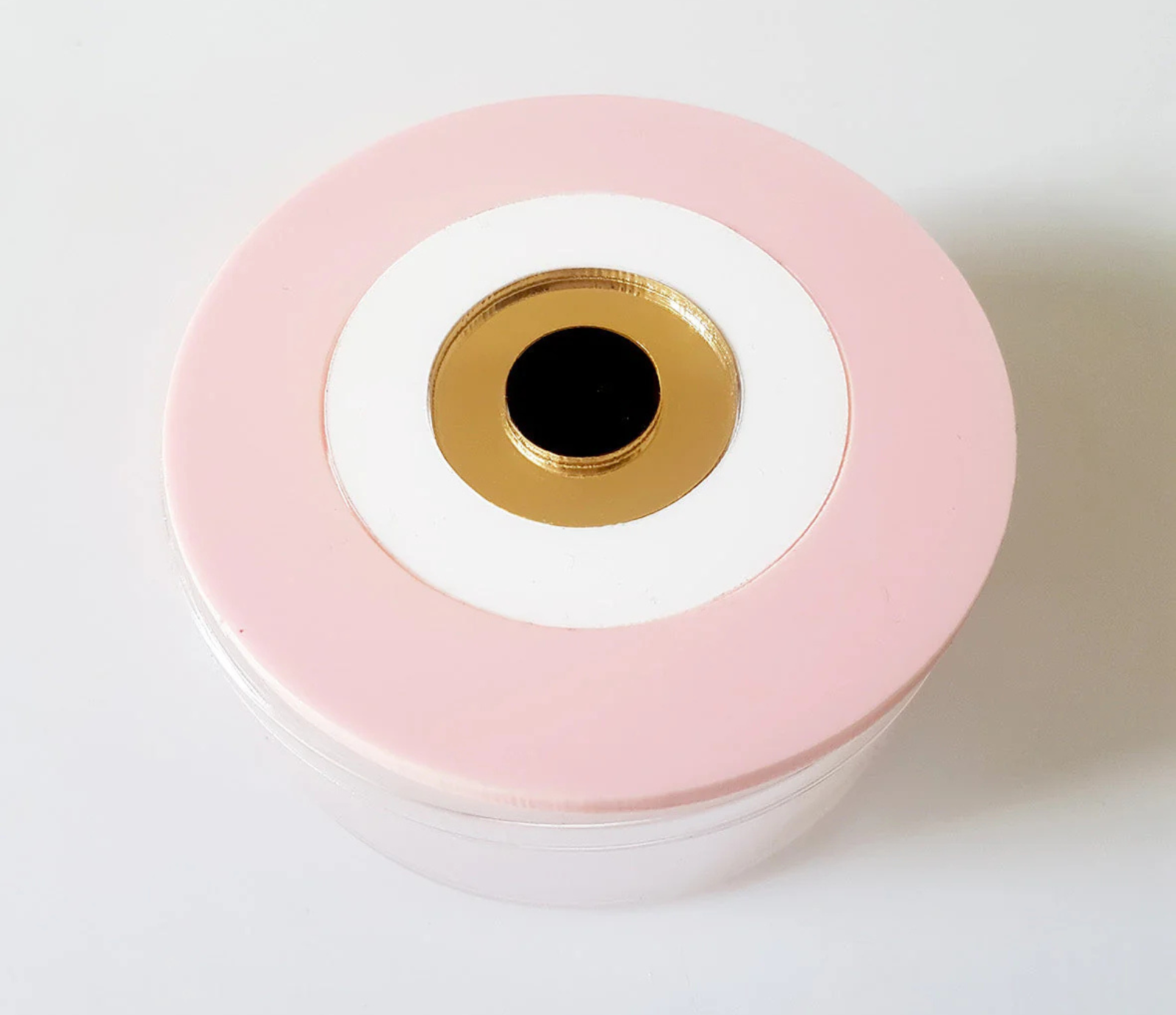 A handcrafted round plexiglass box, designed to combine elegance and practicality.